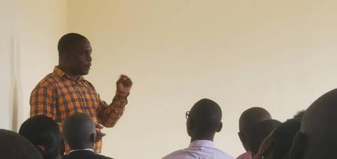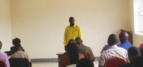 Kizito Martin Luther, the District Planner emphasizing to the members the need for Inter-departmental coordination in improving PDM activities.