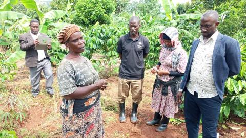 Ms. Nakibuule explaining to the district team the benefits of the Unbound program and her best farming practices in her one-acre coffee garden during the monitoring visit.