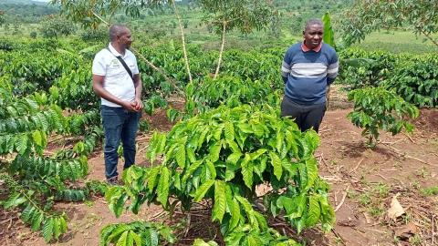 The District Production Officer, Mr. Kiddu Ben, and Gomba District Farmers Association (GODFA) Extension Worker, Mr. Atwiine Emmanuel, inspecting Mr. Kakoto Sabiiti’s three-acre coffee garden while guiding him on improved agronomic practices